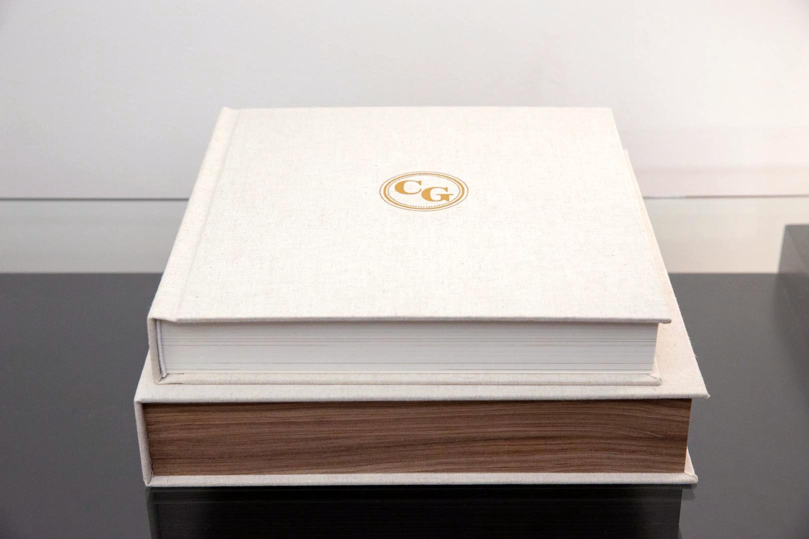 Livros Fotográficos com revestimento em couro natural, tecido, corino ou foto capa de 50 (cinquenta) páginas, acompanhados de uma caixa box.