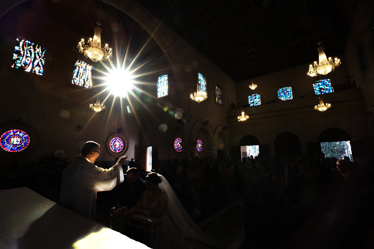 Na cerimônia, a luz que atravessava os vitrais criava uma atmosfera quase mística. Aproveitei o feixe de luz que incidia sobre o altar, realçando o celebrante no ato da bênção. Escolhi uma exposição cuidadosa para destacar o contraste entre as sombras da nave e a luz intensa que adentrava o espaço, iluminando o casal em oração, completamente entregues ao momento.